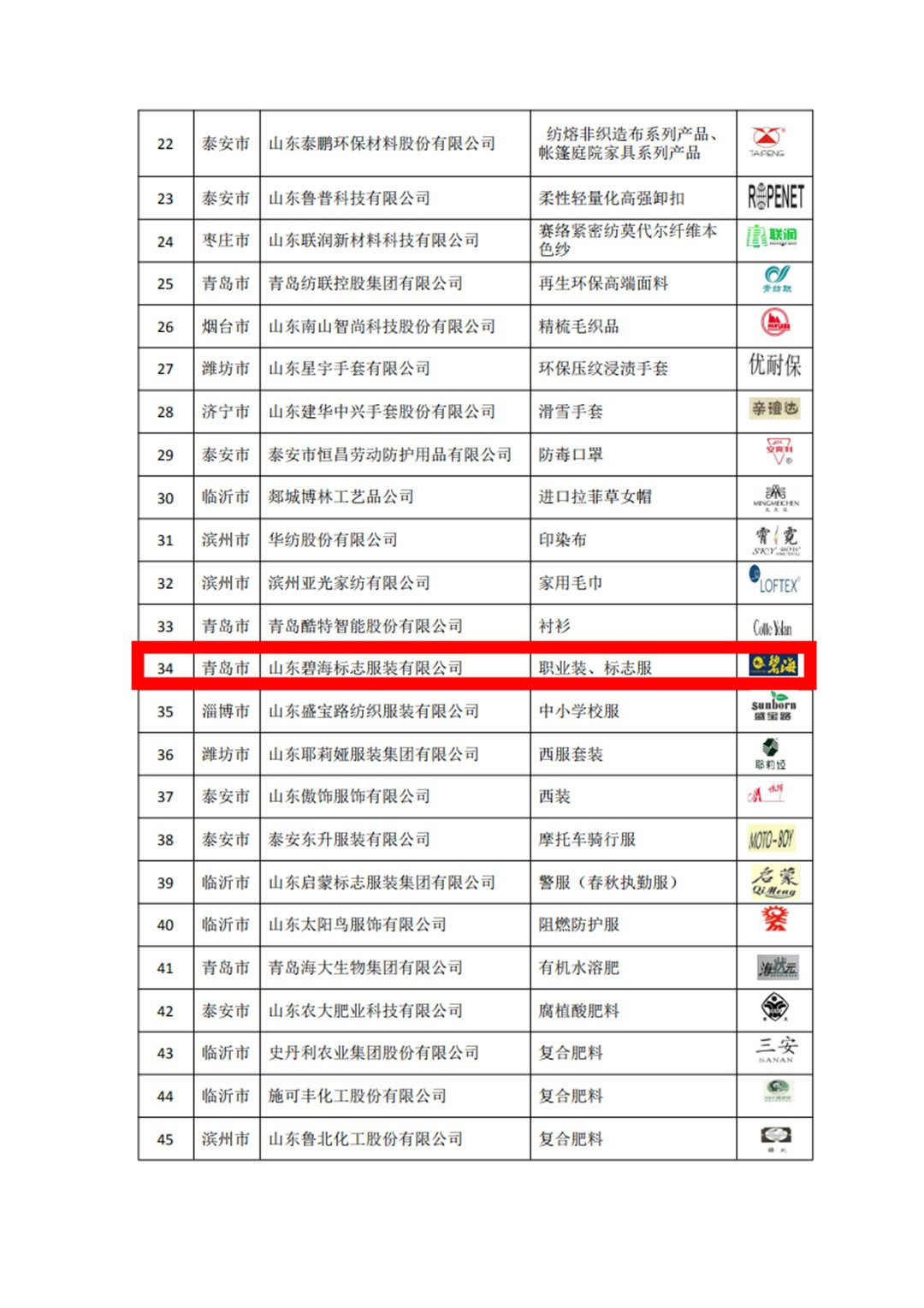 本次山东省优质品牌认定榜单中包含全省509家企业,企业范围涵盖服装、医药、装配制造、新技术研发等多个领域,其中涉及服装企业仅六家,山东碧海标志服装有限公司成为青岛市唯一一家生产职业装、标志服上榜服装企业。