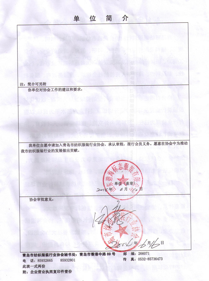 青岛市纺织服装行业协会(Qingdao Textile and Garment Special Union)是青岛市纺织、印染、纺机、服装、服饰、辅料和相关服饰配件生产、科技、教育、流通以及有关联的企事业单位和社会团体自愿组成的、不受经济类型限制的市行业组织。是服务于政府、服务于社会、服务于企业的行业性平台,碧海标志服装有幸加入青岛市纺织服装行业协会,成为会员单位,为今后的发展打下了良好的发展。