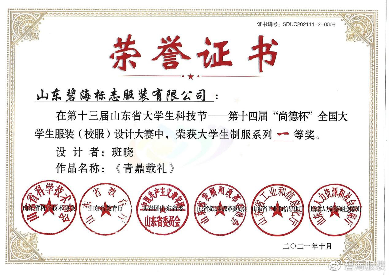 2021年07月03日,由山东省科学技术协会、山东省教育厅、团省委、省发改委、省工信厅、省人社厅联合主办的“第十三届山东省大学生科技节”持续进行。作为本届科技节赛事重要活动之一的“尚德杯”第十四届全国大学生服装设计大赛初赛在山东理工大学鲁泰纺织学院成功举行。本次大赛,历经了两天的作品展示,专家评审团队多轮考核。选出了161幅作品进入决赛圈。 决赛圈评审环节,也是精彩纷呈,每一套设计,都显示出学生的设计构思。本次大赛的设计主题是裳礼?尚德”,围绕大赛“‘裳’礼,尚德”主题,体现“衣礼载道,明德立人”的设计宗旨,本着健康、低碳、环保、绿色的设计理念;突出校园服装及其文化的传承与创新。设计师需在服装中体现出主题和服装设计的相互呼应,构思精巧,符合时代的主旋律等特点。 参赛作品有六大系列:幼儿园制服、幼儿园运动服、大学生制服、大学生运动服、教师职业装、教师运动装。参赛者至少选择任意一系列(六套)参赛,也可选择多系列参赛,不接受少于六套的参赛。 山东碧海标志服装有限公司设计师班晓作品——《青鼎载礼》,获得了第十四届“尚德杯”全国大学生服装(校服)设计大赛大学生制服系列一等奖。