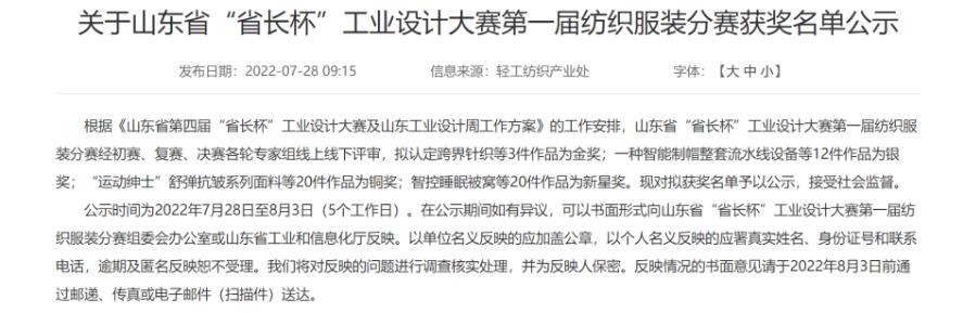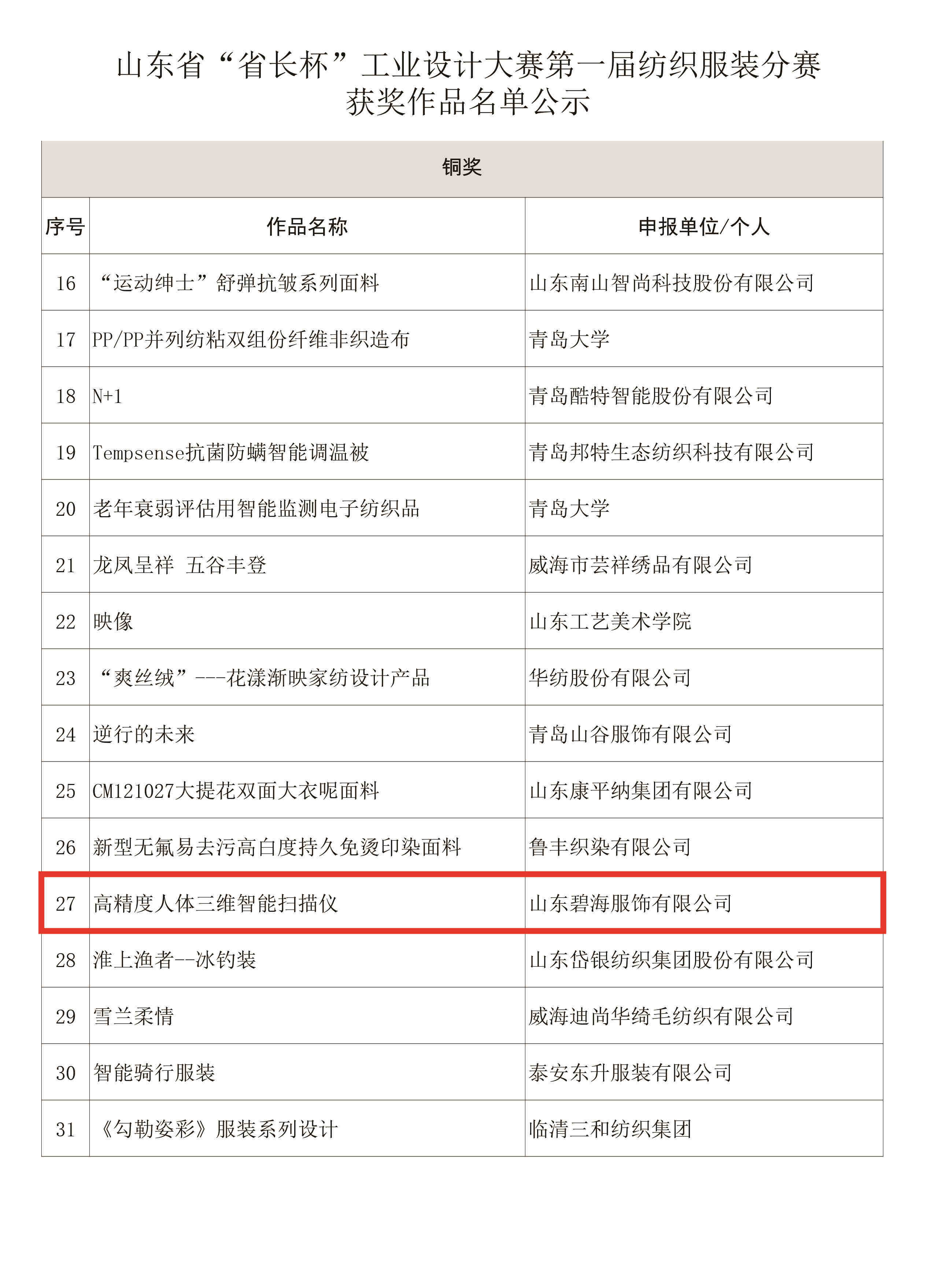 近日来,由山东省人民政府主办,中国工业设计协会支持,山东省工业和信息化厅、山东省教育厅、山东省财政厅、山东省市场监管局、山东省总工会、共青团山东省委、山东广播电视台承办的,山东省各市工业和信息化局、山东省工业设计协会协办的山东省“省长杯”工业设计大赛第一届纺织分赛落下帷幕。 2022年07月28日,山东省工信厅发布了山东省“ ”工业设计大赛第一届纺织分赛的评审结果。本次大赛,经过了初赛、复赛、决赛的三轮专家评审,对线上材料和线下实物展示等多方面结合,山东碧海标志服装有限公司旗下分公司——山东碧海服饰有限公司研发的高精度人体三维智能扫描仪荣获山东省“省长杯”工业设计大赛第一届纺织分赛铜奖。