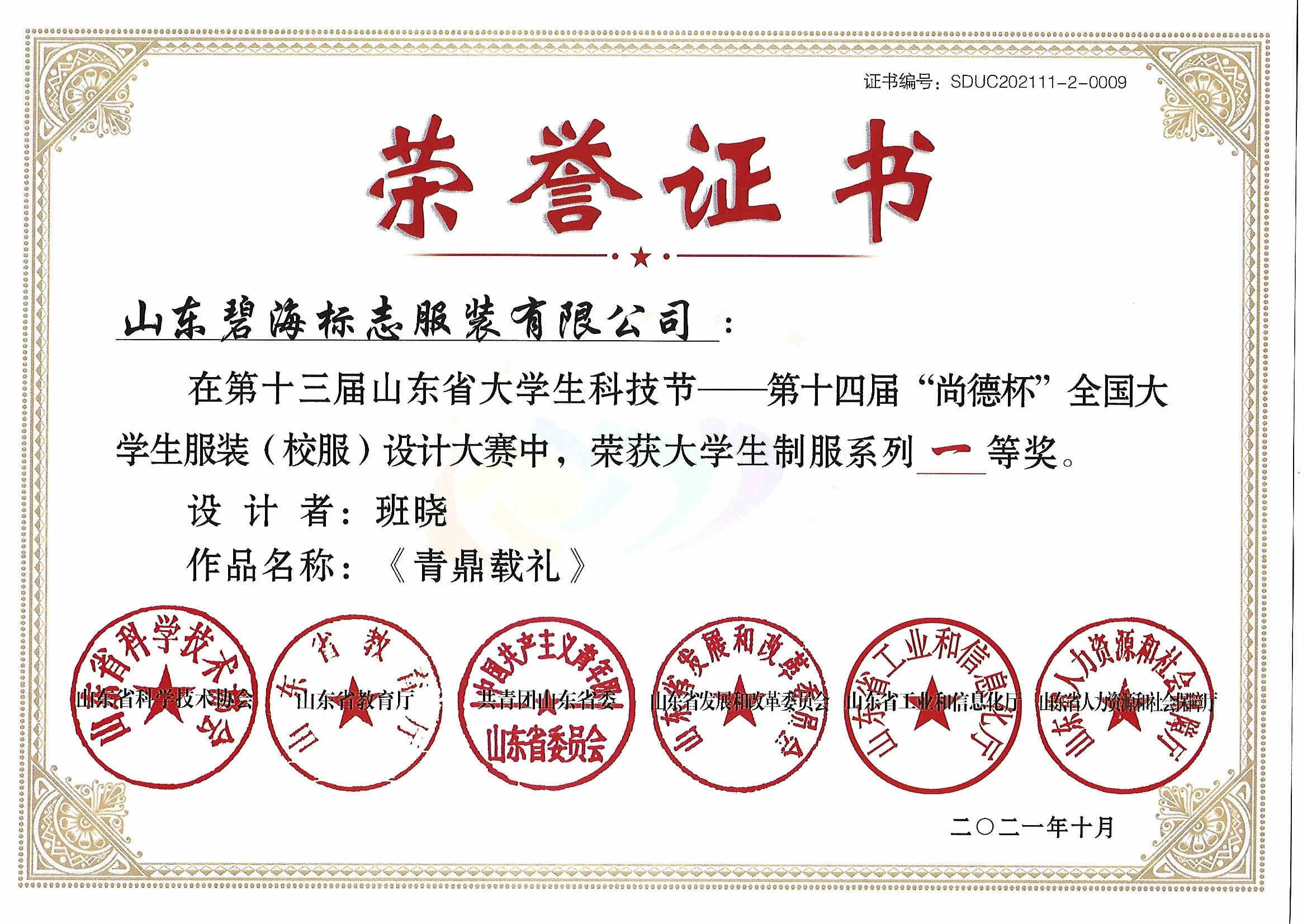 山东碧海标志服装有限公司喜获山东省“省长杯”纺织分赛铜奖